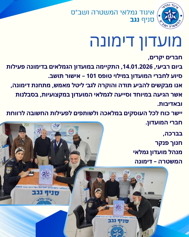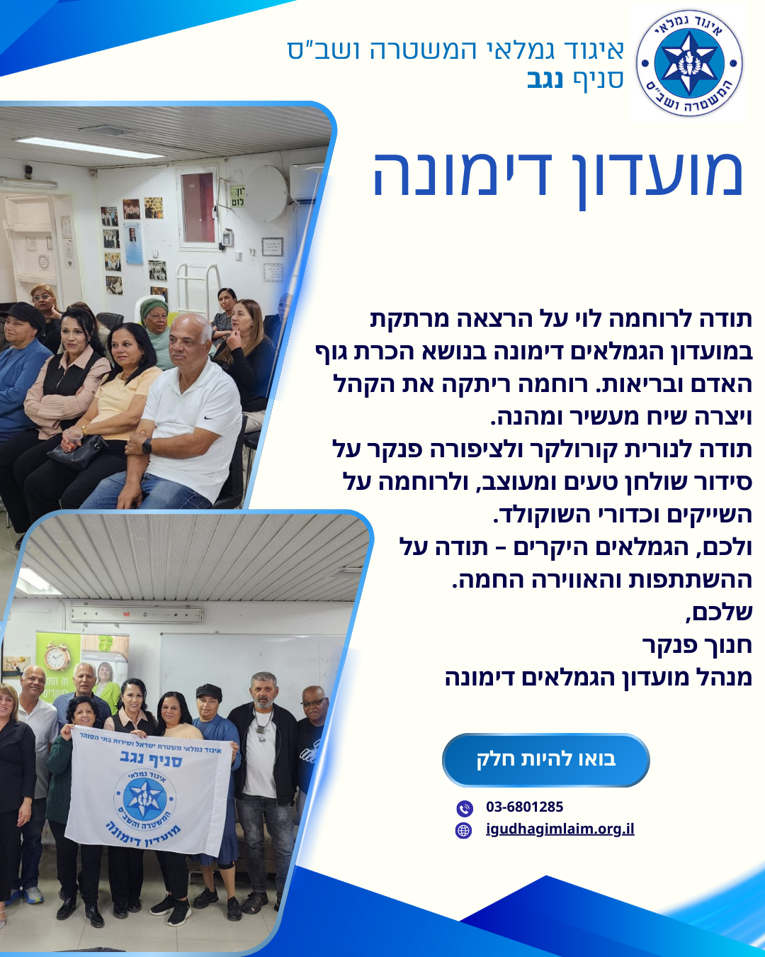 מועדון דימונה של האיגוד לגמלאי המשטרה ושירות בתי הסוהר מהווה מרכז קהילתי חשוב לפנסיונרים המתגוררים בעיר דימונה ובסביבותיה. המועדון מציע מגוון רחב של פעילויות ואירועים שנועדו להעשיר את חיי החברים, לחזק את הקשרים החברתיים, ולספק תמיכה לקהילת הפנסיונרים. בין הפעילויות שמתקיימות במועדון ניתן למצוא: מפגשים חברתיים: אירועים תקופתיים שבהם החברים יכולים להיפגש, לשוחח ולהתחבר עם פנסיונרים אחרים מהאזור, ולהשתתף בפעילויות חברתיות מגוונות. חוגים שונים: חוגים המיועדים לצרכים ולתחומי העניין של חברי המועדון, כולל חוגים יצירתיים, חוגי ספורט, וחוגים לימודיים המותאמים למגוון גילאים ותחומי עניין. הרצאות וסדנאות: הרצאות בנושאים שונים כמו תרבות, היסטוריה, בריאות, וטכנולוגיה, וסדנאות יצירה המאפשרות לחברים ללמוד כישורים חדשים ולהביע את עצמם בצורה יצירתית. טיולים וסיורים: טיולים מאורגנים וסיורים באתרים שונים בארץ, המיועדים לספק חוויות חדשות ולשבור את השגרה היומיומית. אירועים תרבותיים: מופעים, הופעות, ופעילויות תרבותיות המיועדות להעשיר את חוויותיהם של החברים וליצור אווירה חמה ותומכת. בנוסף לפעילויות השונות, המועדון מעניק סיוע ותמיכה לחברים לפי הצורך, כולל עזרה לנזקקים ותמיכה אישית. המועדון שואף ליצור סביבה תומכת ונעימה, שבה החברים יכולים ליהנות מהפעילויות, להרגיש שייכים, ולהיות חלק מקהילה פעילה ומחבקת. מועדון דימונה מהווה מוקד חשוב עבור גמלאי האיגוד בעיר ובסביבותיה, ומאפשר להם להשתתף בפעילויות מגוונות, לקבל תמיכה במידת הצורך, ולתחזק קשרים חברתיים משמעותיים.
