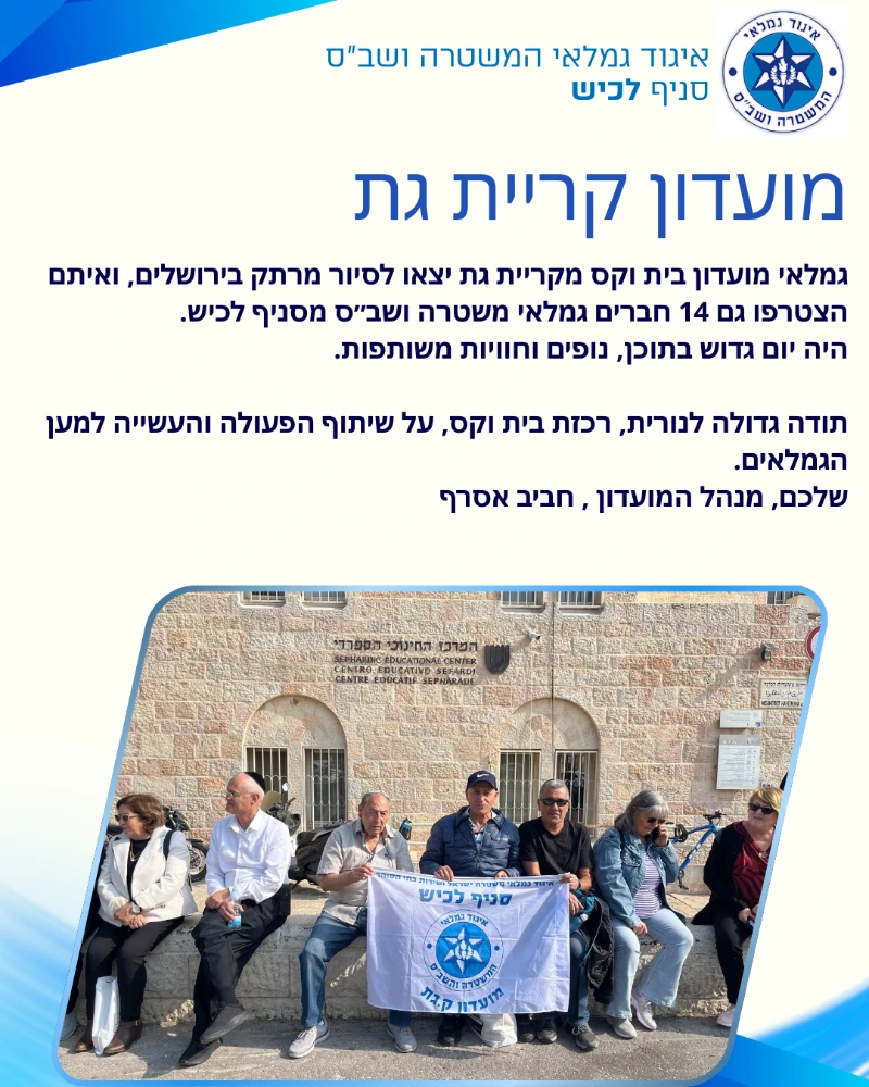 מועדון הגמלאים בקריית גת מהווה מרכז קהילתי לפנסיונרים של המשטרה ושירות בתי הסוהר בעיר. המועדון מציע מגוון פעילויות, כולל: מפגשים חברתיים: אירועים קבועים למפגש עם חברים מהאזור. חוגים וסדנאות: חוגים יצירתיים וחוגי ספורט המיועדים לצרכים ולתחומי העניין של חברי המועדון. הרצאות: הרצאות בנושאים מגוונים כגון תרבות ובריאות. טיולים וסיורים: טיולים מאורגנים וסיורים באתרים שונים. אירועים תרבותיים: מופעים ופעילויות תרבותיות להנאה ולהעשרה. המועדון שואף לספק סביבה תומכת ונעימה, בה החברים יכולים ליהנות, להרגיש שייכים, ולתחזק קשרים חברתיים משמעותיים.